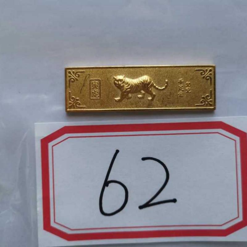 46 | 标的拍卖顺序号[44]--拍品编号(62)、(66)、(61)、(60),检验报告检测:纯度999‰,重量200.106克 | 辽宁辽银金银珠宝检验站 | NO.2021034 | 足金(含金量999‰) | 50.019 | 正面:从左到右依次刻有:①“寅虎”字样;②浮雕“虎”图案;③“千足金”字样;④“50克”字样 | 50,000.00 |